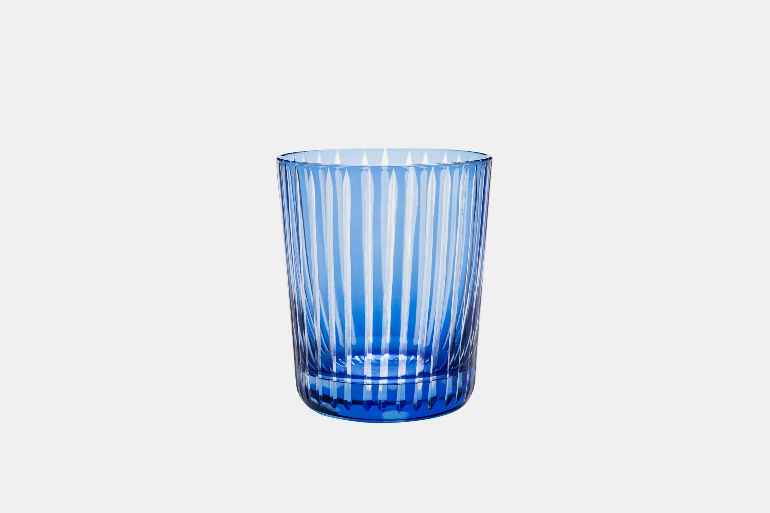 Description: Glass tumblers in cobalt blue colour, with etched motive on surface.
