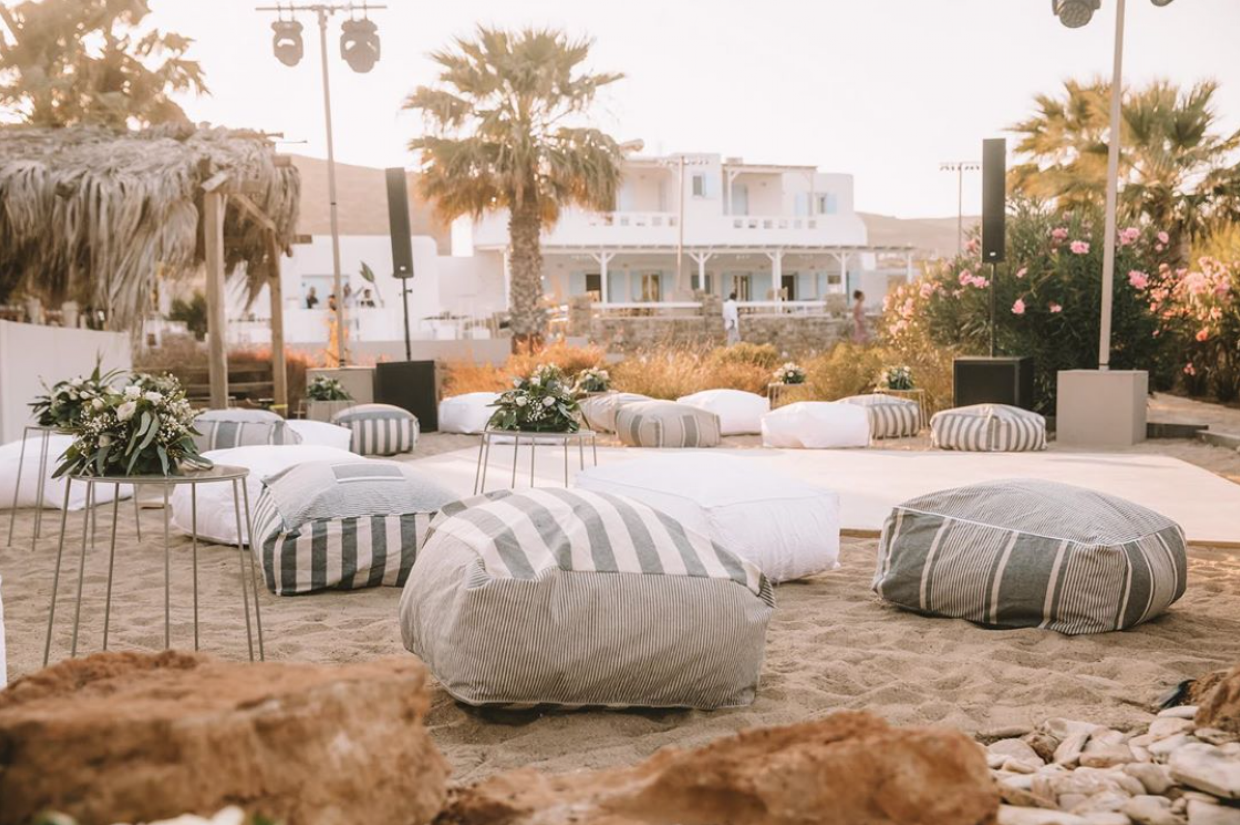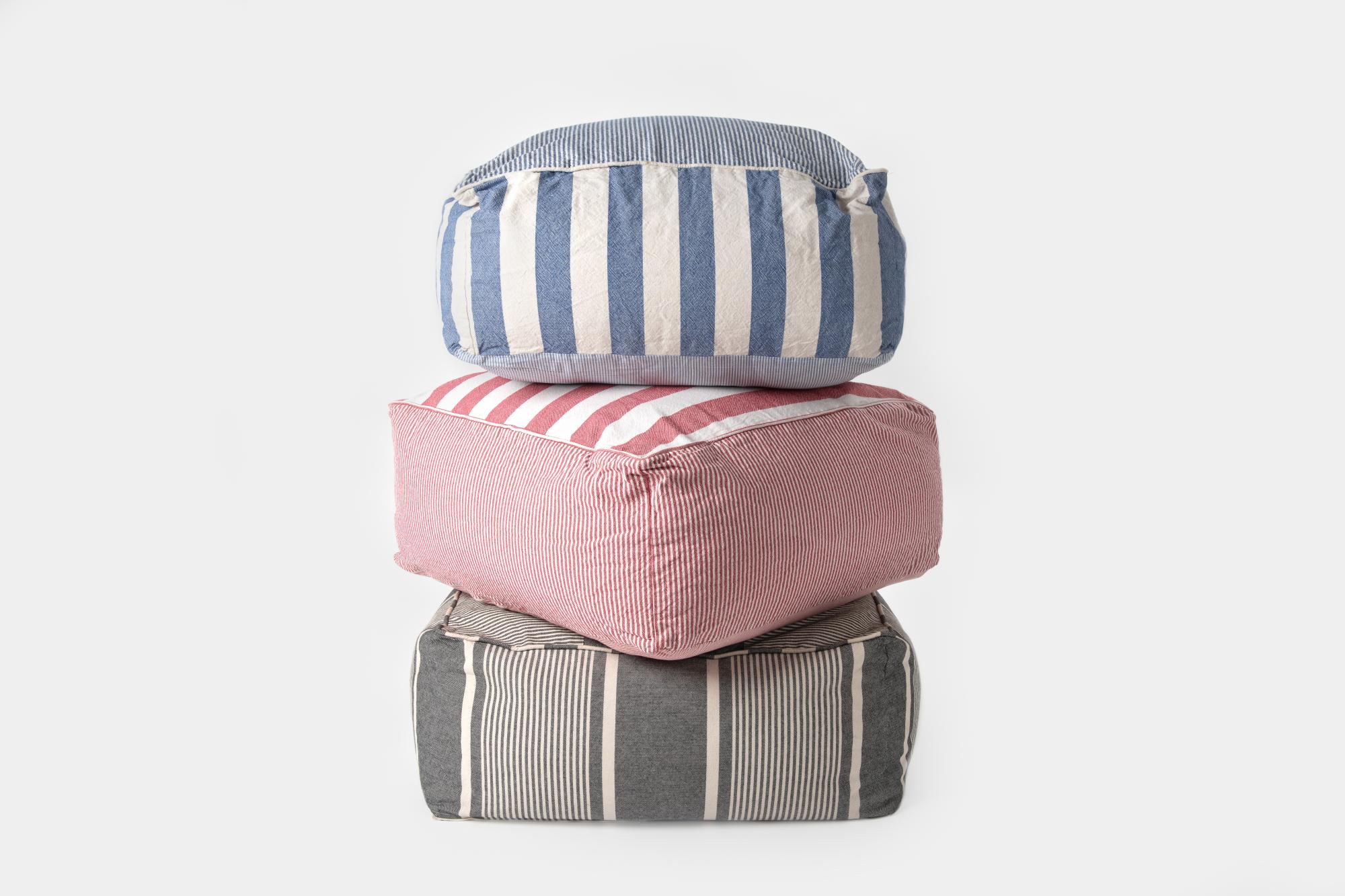 Description: Pouf with grey & white striped cover. Differently striped original Greek fabrics have been mixed and matched for this look.
