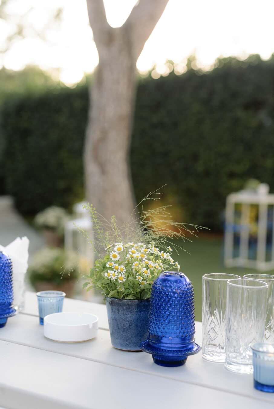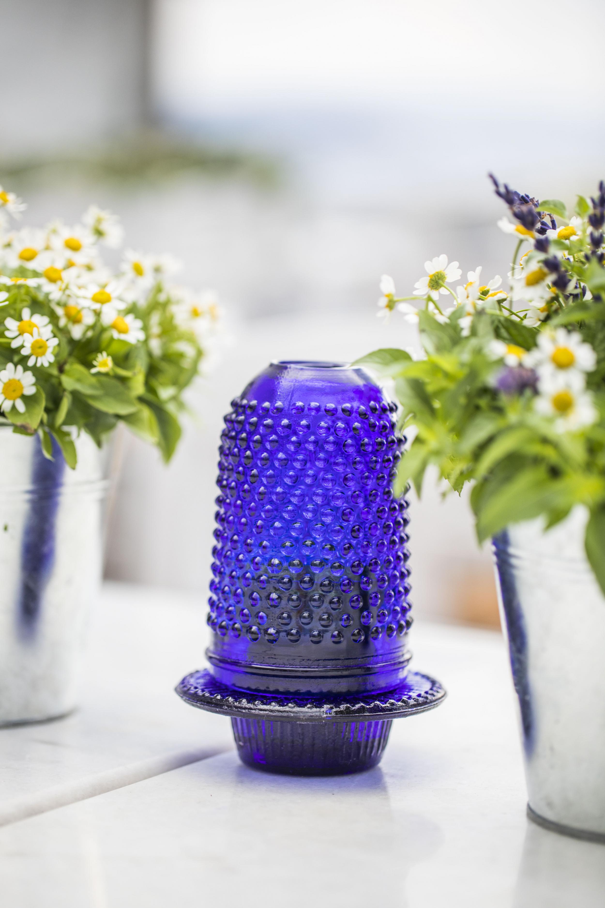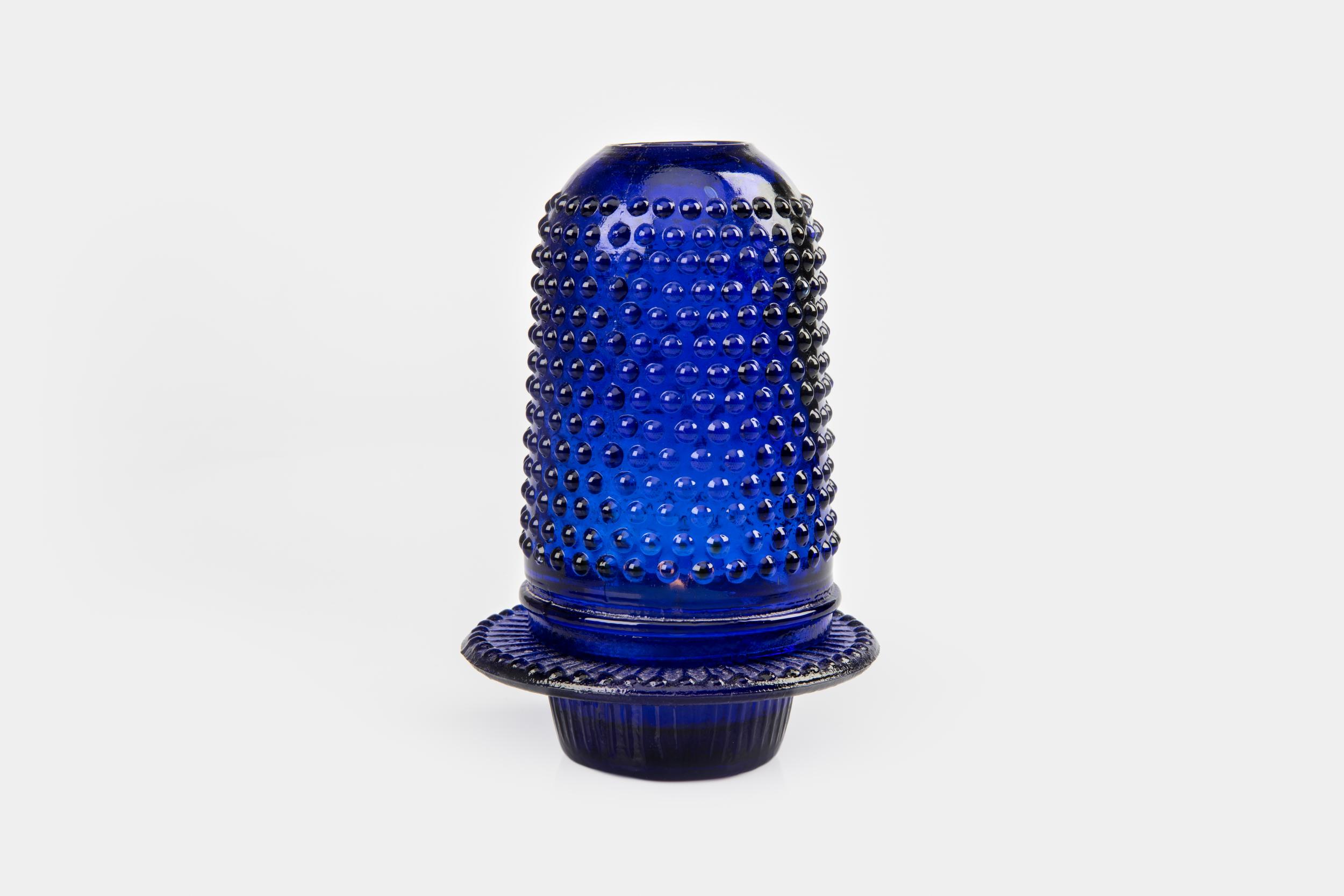 Description: Blue glass with bubble surface. Below part for candle & cover with hole.