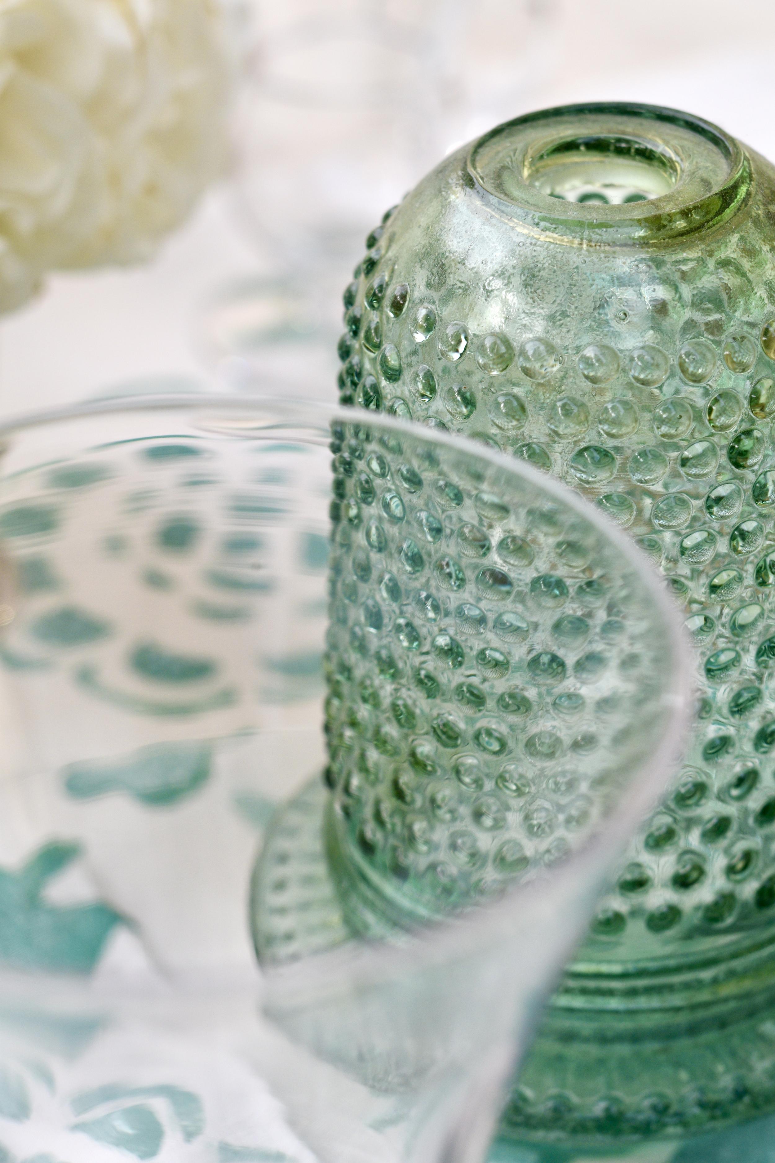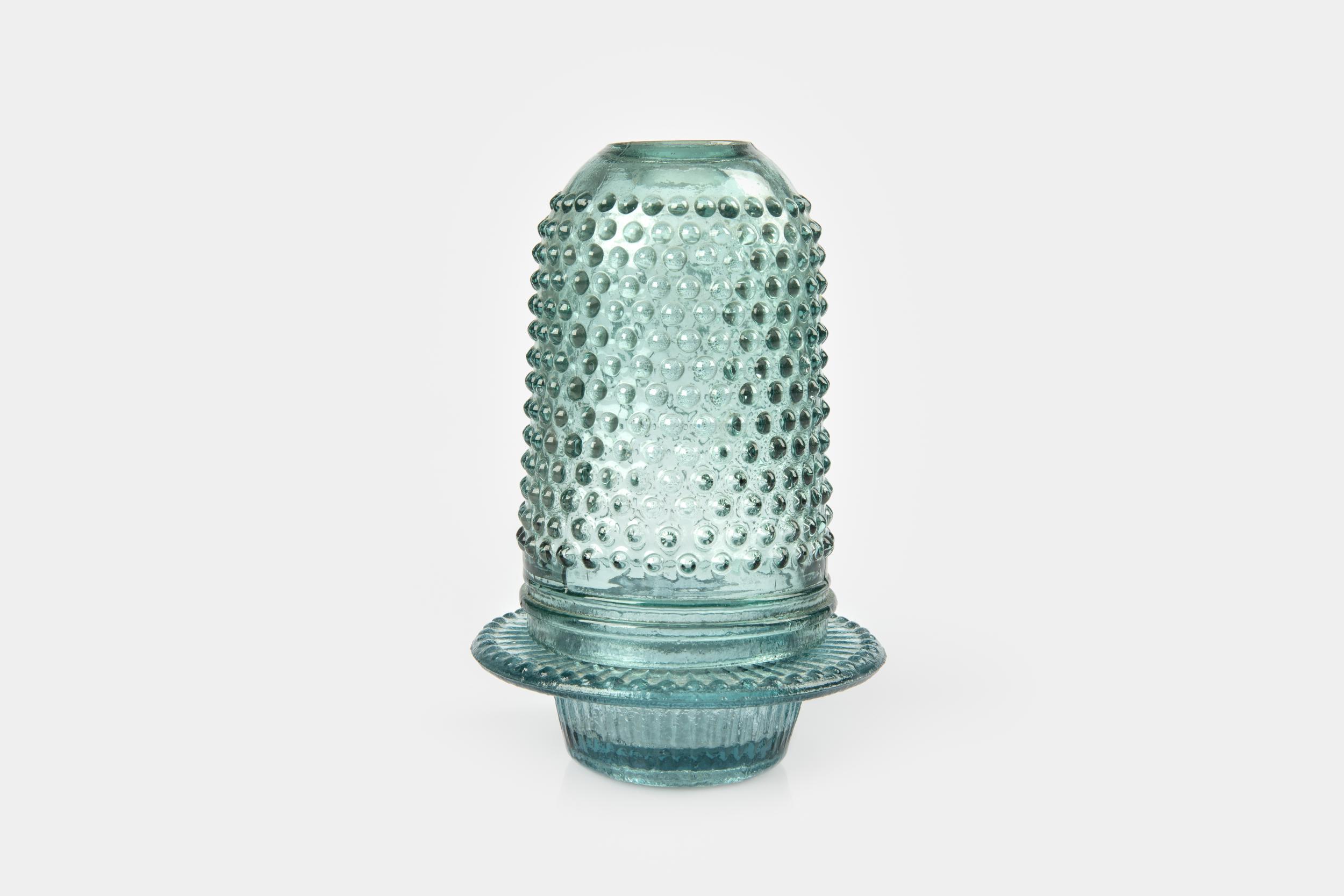 Description: Natural green tint glass with bubble surface. Below part for candle & cover with hole.
