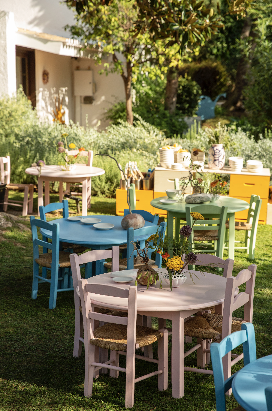 Description: Small size tavern chairs in pink, light blue, purple and green colours. Wooden frame with woven seat.