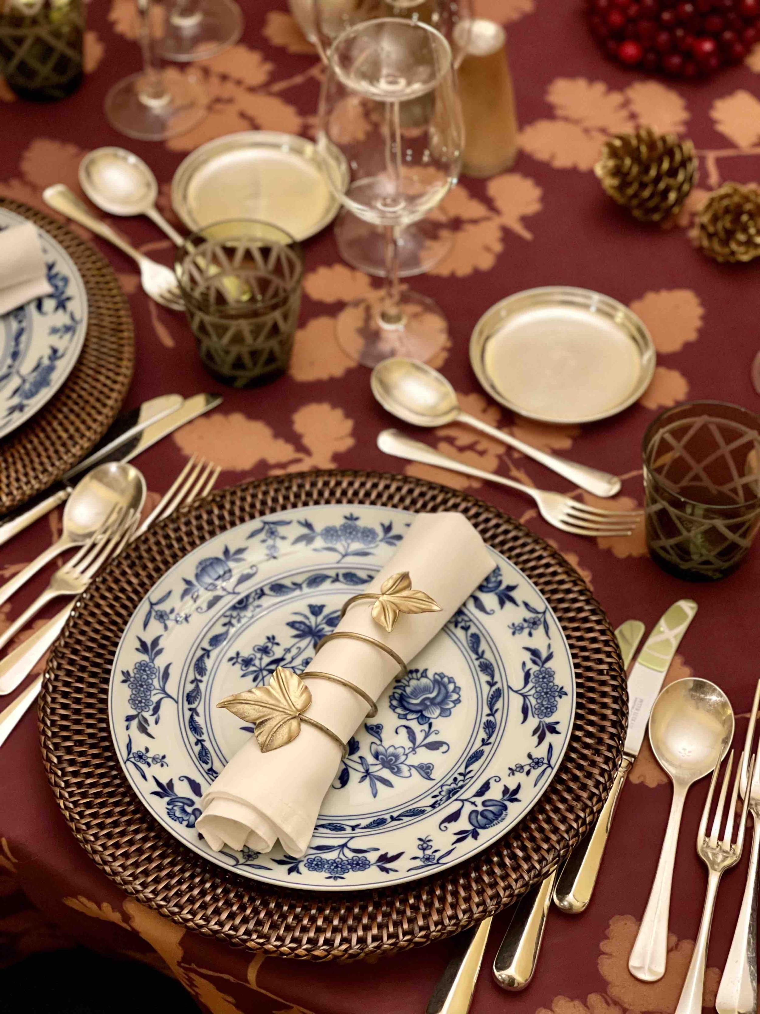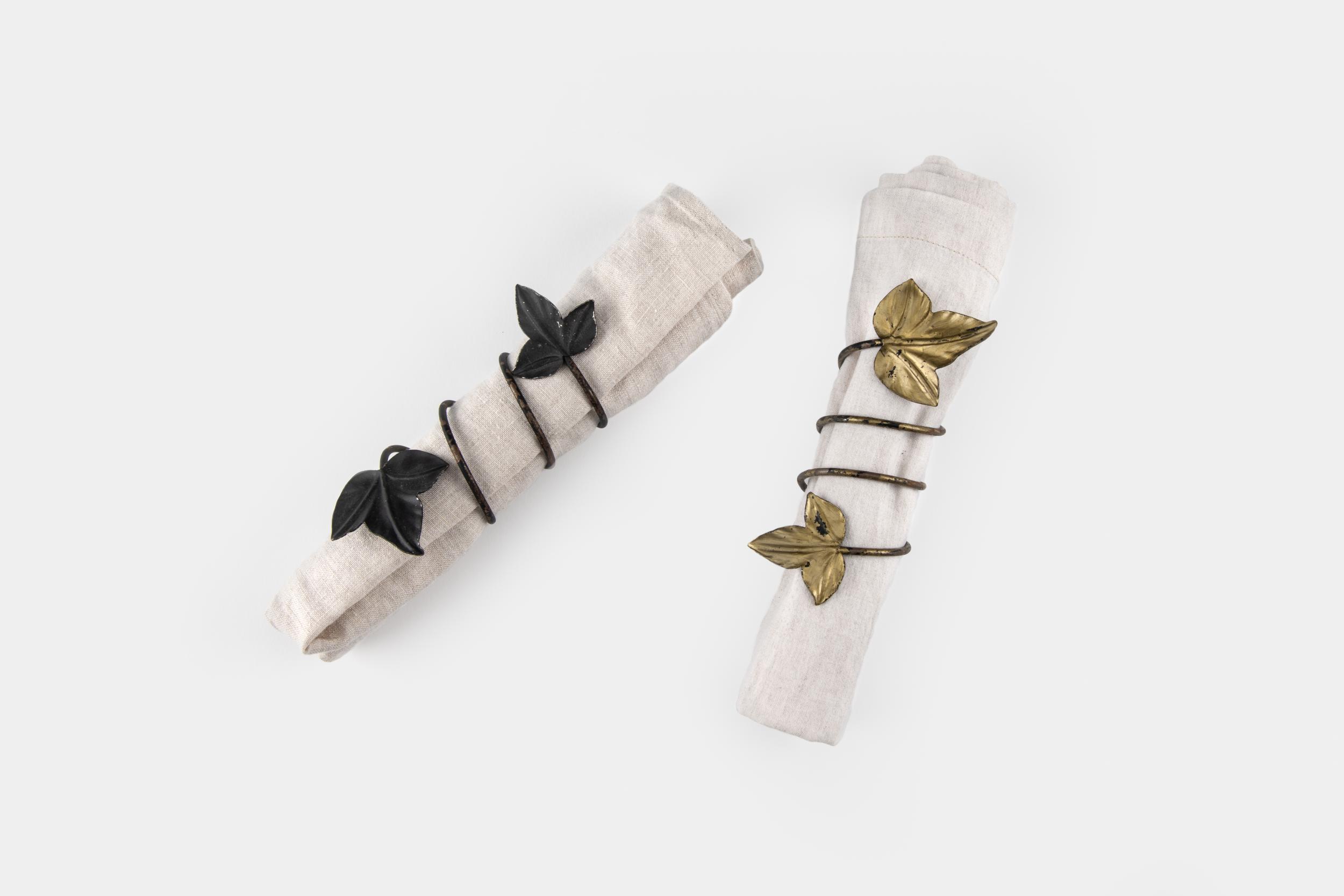 Description: Rustic style, metal leaf design napkin rings in dark and golden finish