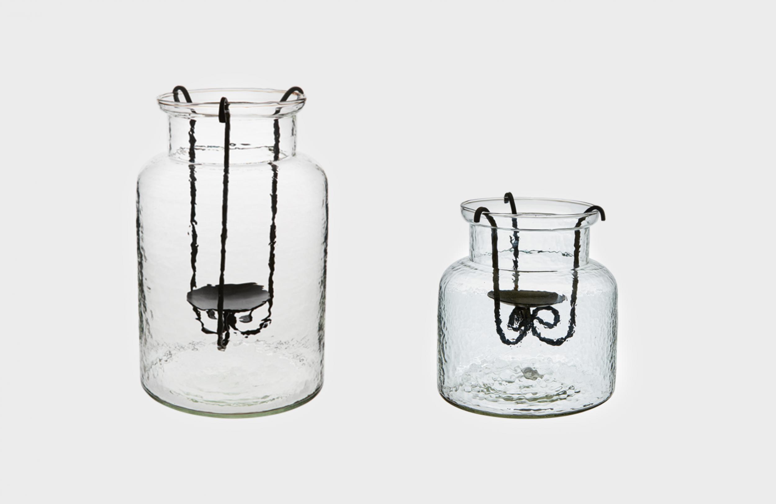 Description: Glass lantern with iron candle holder in 2 sizes.