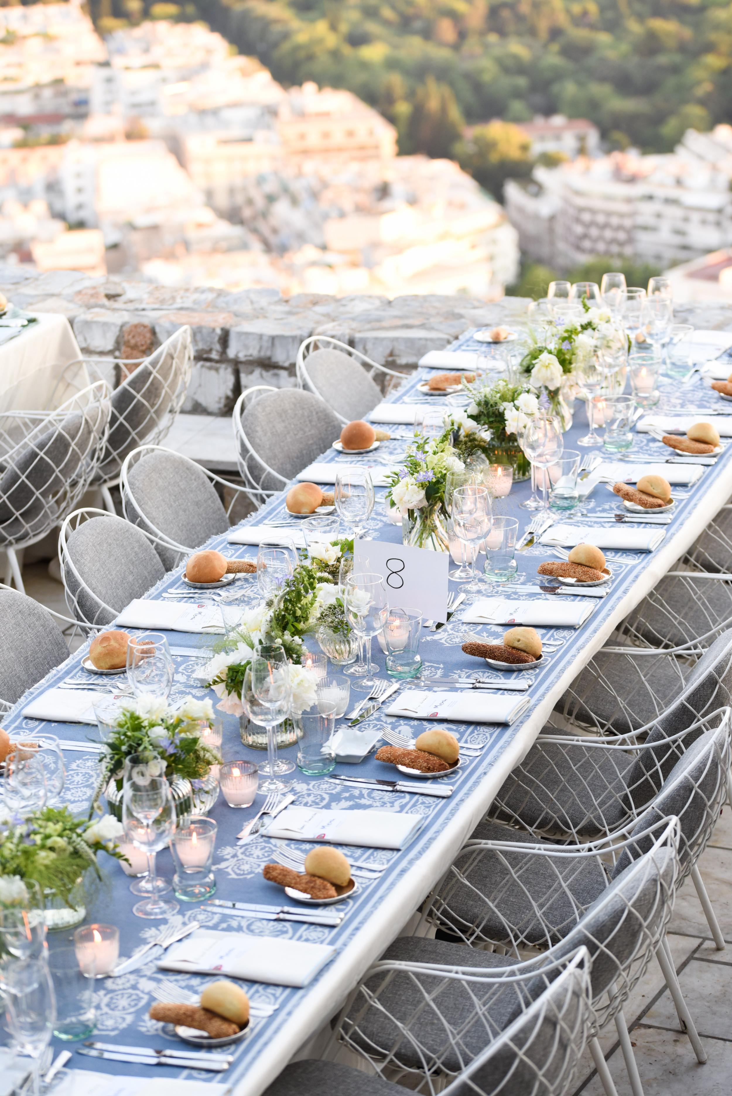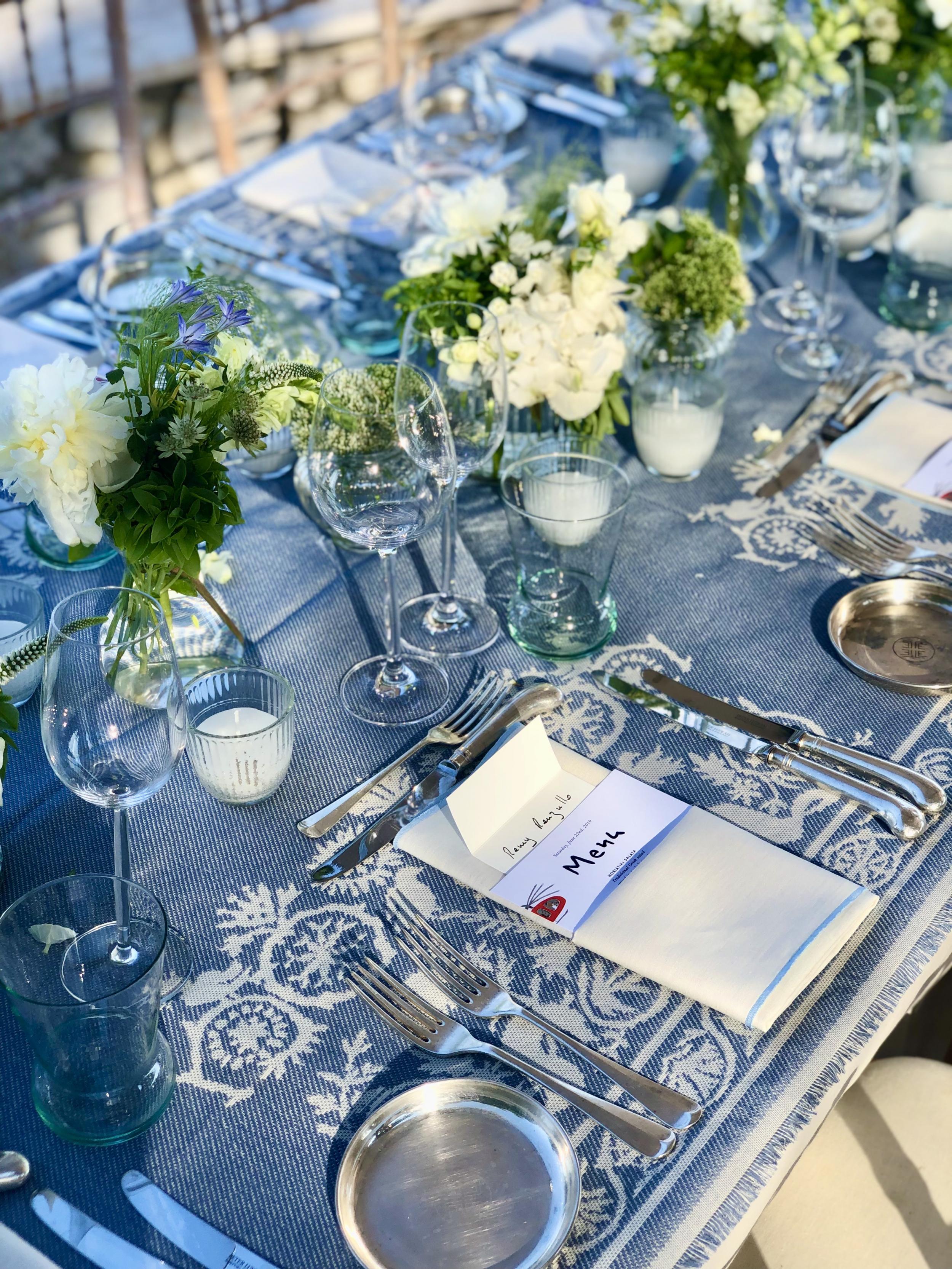Off white linen napkin with light blue stitching