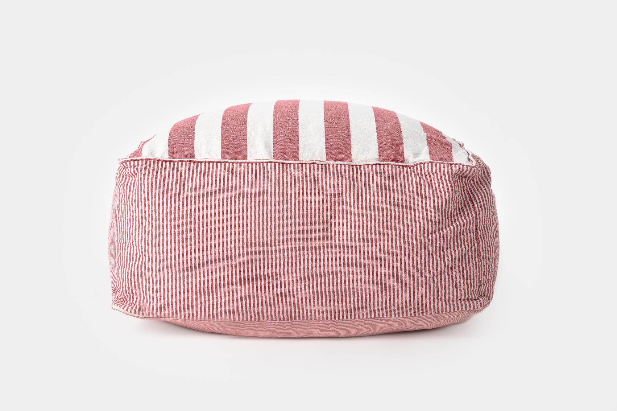 Description: Pouf with pink & white striped cover. Differently striped original Greek fabrics have been mixed and matched for this look.